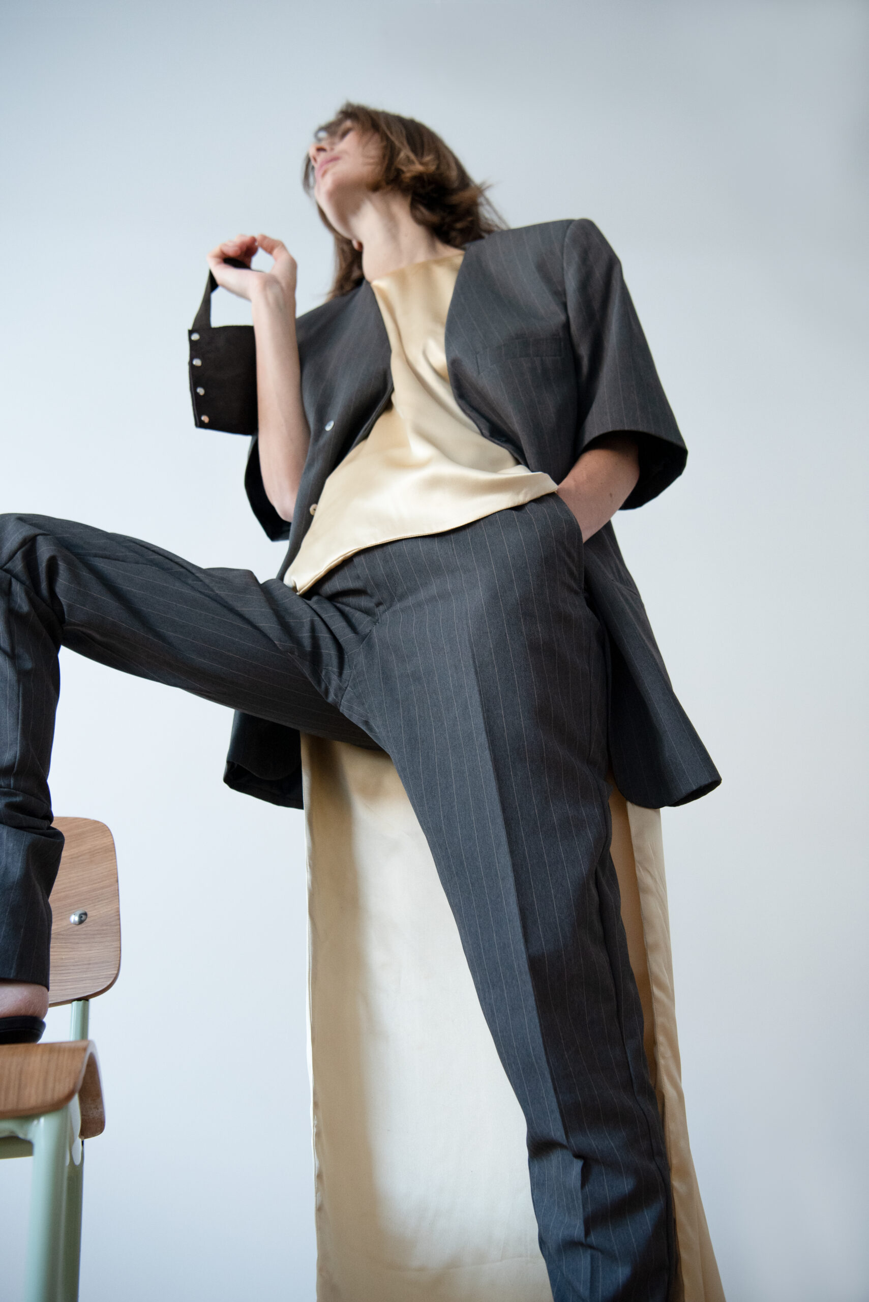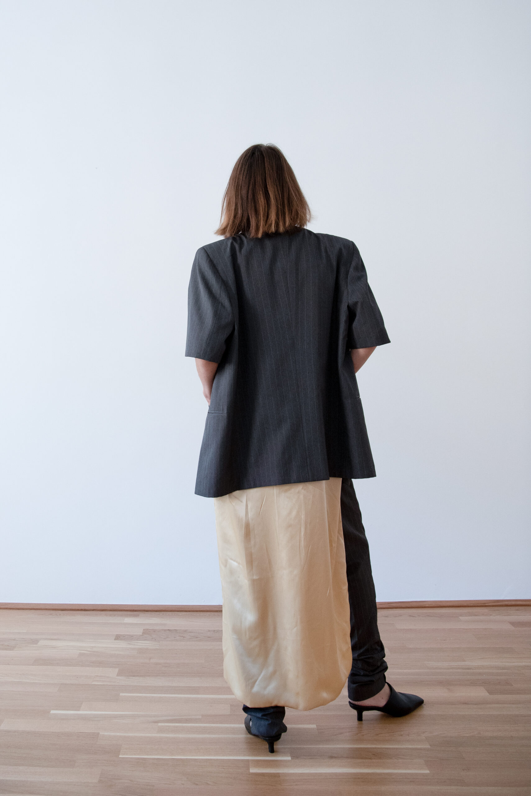Oversized fit, short sleeves. High-low hem, front 60 cm, back 131 cm. Double-layered silk, fully lined. Can be worn reversed for the long side at the front. One-of-a-kind, sustainably sourced.