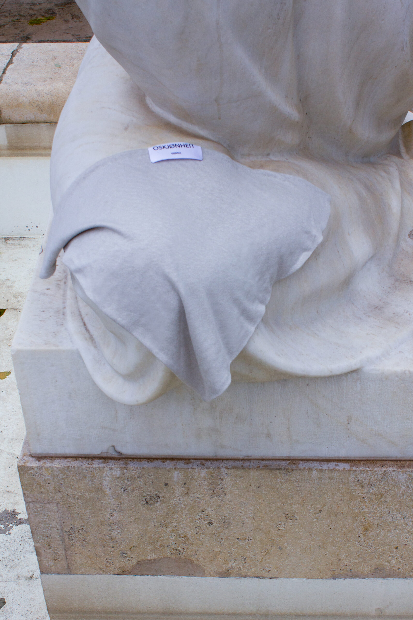 Ice-colored triangle scarf made from deadstock cotton and linen blend. Double-layered, made from two triangles sewn together. Measures 70 cm wide and 47 cm long. One-of-a-kind, sustainably sourced.